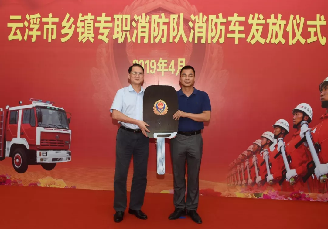 市委常委、常務副市長胡海運出席儀式并為羅定市、新興縣和云安區的代表發放消防車鑰匙。云浮采購13輛3.5噸水罐消防車正式上崗