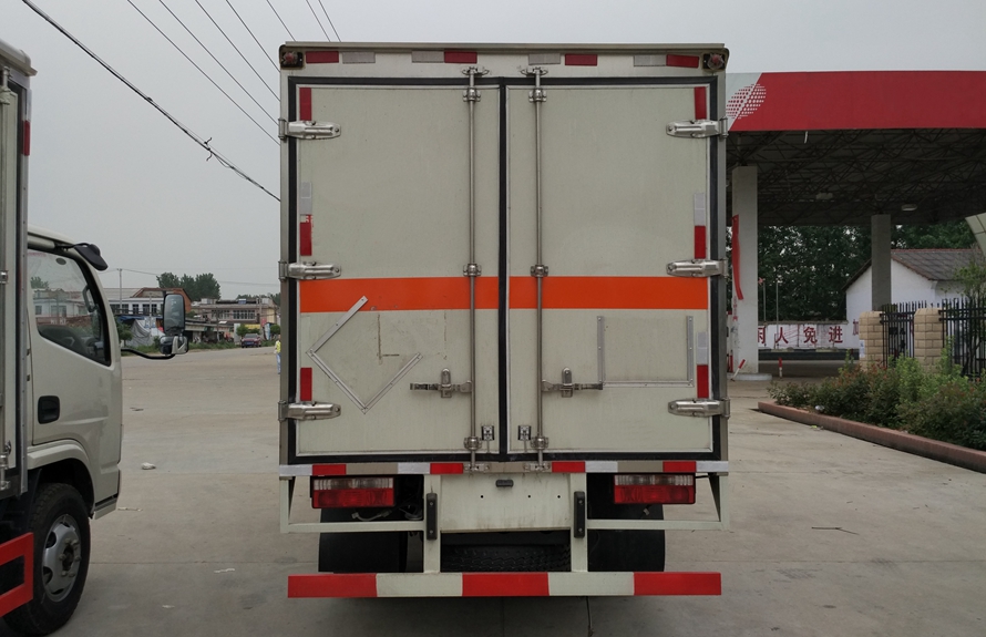 1、廂體部分:廂體為雙層金屬骨架結(jié)構(gòu),外部為冷扎鋼板,內(nèi)壁采用鋁合金板蒙面,夾層為隔熱阻燃材料填充。設(shè)置對開門,側(cè)壁設(shè)有防雨功能自然通風(fēng)窗口,以使廂內(nèi)外空氣流動,廂體內(nèi)部做防靜電處理,廂體底部與廂內(nèi)前部鋪有阻燃導(dǎo)靜電膠板,并與底盤等電位連接,通過車輛后端的導(dǎo)靜電裝置與大地相連,可防止靜電火花的產(chǎn)生和車輛靜電及時釋放,提高易燃?xì)怏w廂式運(yùn)輸車的安全性。廂體內(nèi)部前面和側(cè)面裝有固定拉環(huán),與捆綁帶使用捆綁貨物以避免移動,保證安全。